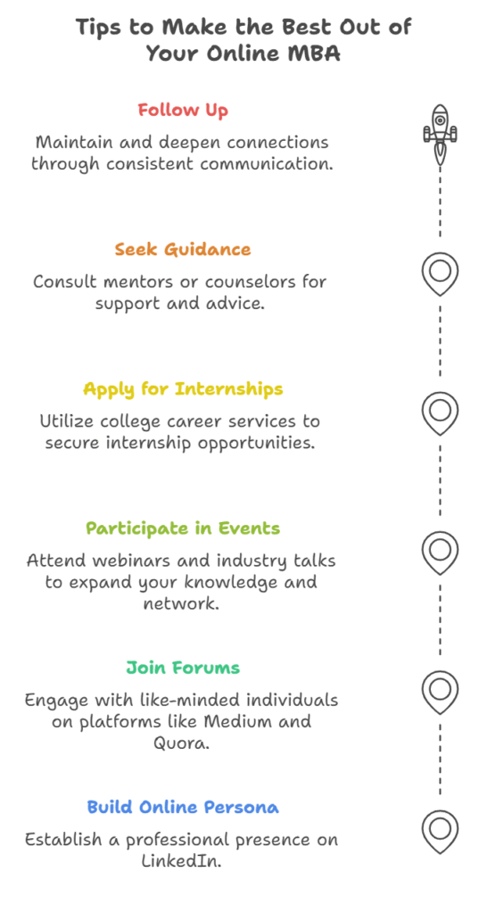 👉Don’t be afraid to seek guidance from your mentor or counsellor. Strong support can significantly enhance your online MBA experience. Their guidance would help you gain clarity, motivation, and techniques to tackle complex issues.